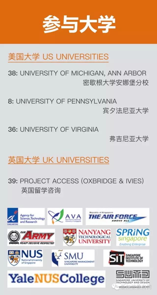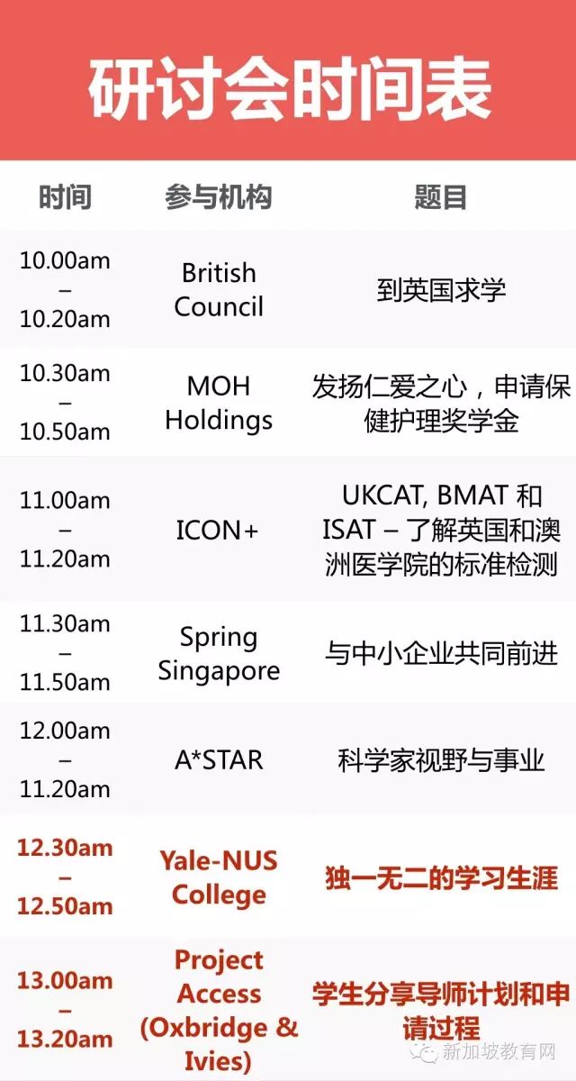 颁发奖学金的机构负责人和顶尖大学的代表将在现场为出席者提供各种丰富的信息!有丰富多彩的演讲会,去英国、去澳洲、去美国、继续留在新加坡……你的疑问,他们在这一天里帮你通通解决。