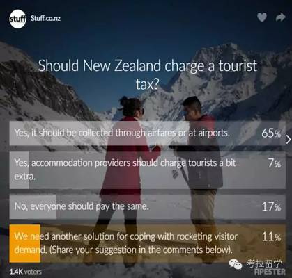 这个提议呢,虽说现在还没通过,但是付诸实现的可能性很大,因为支持的人很多。为什么这么说呢?其实之前有新西兰媒体对提议展开了一个投票调查,询问大家“新西兰应该收取旅游税吗?”目前,有72%的人都投了赞成票,这些赞成的人中,基本都认为应该在机票中涵盖或者在机场收取,只有17%的人认为不只是那些来新西兰旅游的人应该交税,所有人都应该一视同仁。